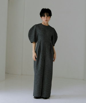 お袖の立体感が華やかでより小顔効果をもたらし、ウエストよりやや上の切り替えにより足を長くまっすぐに見せてくれます。