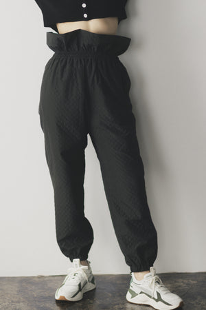 ウエスト部分に大胆なフリルがあしらわれたジョガーパンツ。 低身長の人に中々合わない裾絞りデザインは着丈を計算し、低身長の方でもバランスよく履きこなせるようにデザインにしました。 ハイウエスト位置にある大きなラッフルフリルは腰位置を高く、脚を長く見せてくれます。 日常のコーディネートにポイントが欲しい時にぴったりのパンツです。
