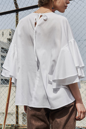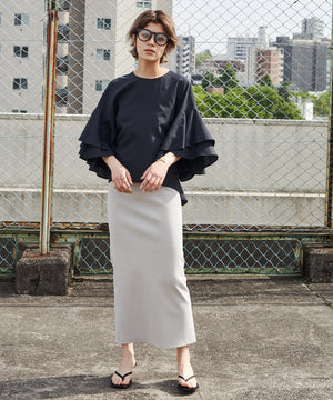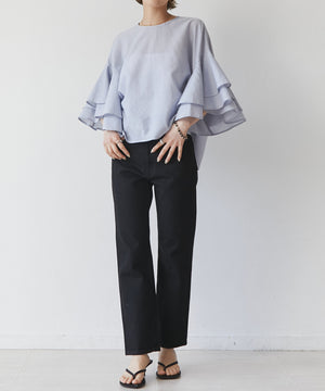 袖のボリュームが華やかさを演出してくれる、デコラティブブラウス。気になる二の腕をカバーしてくれる、気の利いたスリーブデザイン。どのようなスタイルでもコーディネートが決まりやすい着丈は、シーンを選ばず着ていただけます。真夏の暑い時期でもまとわりつかない、ちょうど良い薄さのコットン100%を使用。通気性がよく速乾性もあります。大人っぽい目の細かい綺麗な表面の素材です。