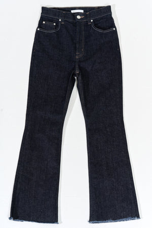 ストレッチの効いた、履き心地の良いフレアデニムです。腰回りから太ももにかけてはすっきりと。裾に向かってやや広がるデザインのフレアシルエットは、小柄な方でもより脚を長く細く見せてくれるデザインです。裾はあえて切りっぱなし加工にすることで、足元を軽くすっきりとした印象に見せてくれます。お直しができないフレアデザインだからこそ、お直し無しで着用いただけるサイジングに。スウェットやニット等、上半身にボリュームを出したスタイリングにピッタリです!